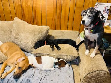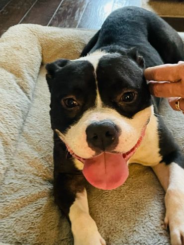 As for me, I’m a big cuddler who loves getting close to my favorite humans. You’ll often see me with my front half on the sofa and my back half still on the floor, just because of my missing leg. I enjoy rough play with my furry friends, but my heart truly belongs to my person. I adore spending time with my foster mom.
