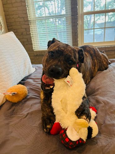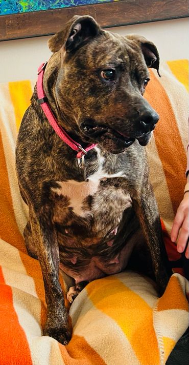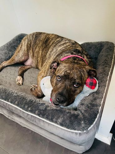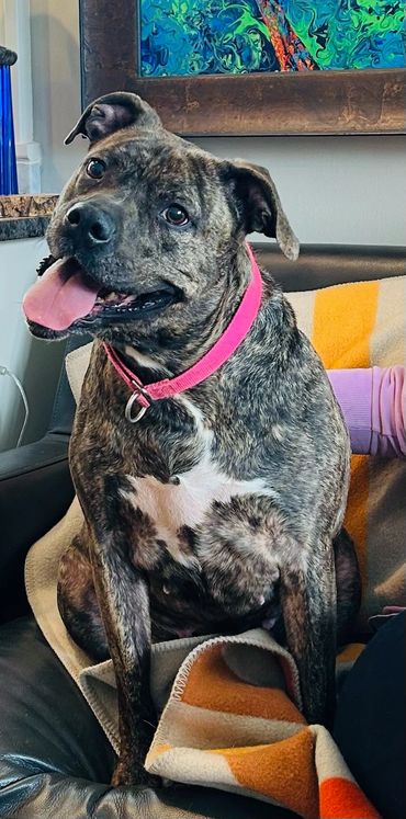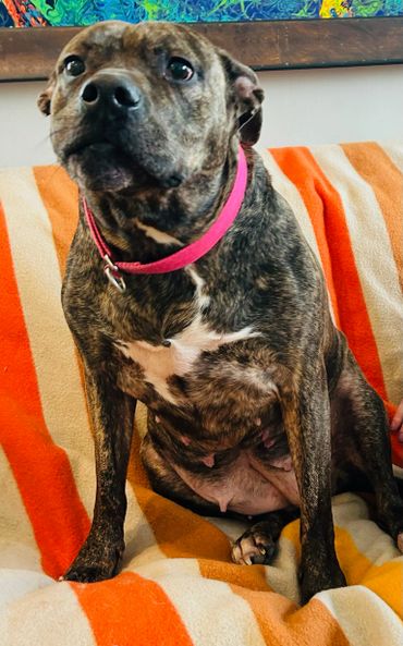 I know my mouth looks a little unusual after being shot, so I might look a little scary, but I hope people can see how beautiful I am inside and out. I’ve gone from just 55 pounds when I was found to a solid 74 pounds now, and my brindle coloring shines in the sun! My foster mom and dad tell me how beautiful I am all of the time despite how my mouth looks.