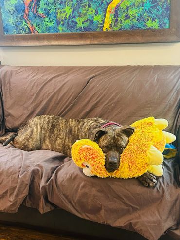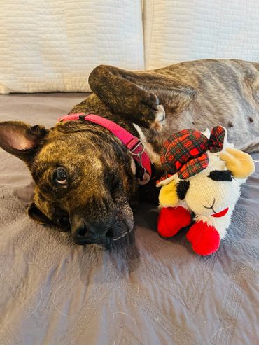 My favorite thing in the world? My yellow llama toy, which I love to toss around! I also really want to be friends with the cat in my foster home, but I've learned to keep my distance because he sometimes bops me on the head. My foster canine siblings told me there is a reason he was named Monster so we are all afraid of him. My foster dad thinks it’s super cute I have really short legs that seem to be double jointed that can go out sideways when I am playing. He says it adds to my cuteness but it also boggles his mind how weird I can move them when I play. On the note of my play style, I play pretty rough, so I think I’d do best as the only dog in the house.